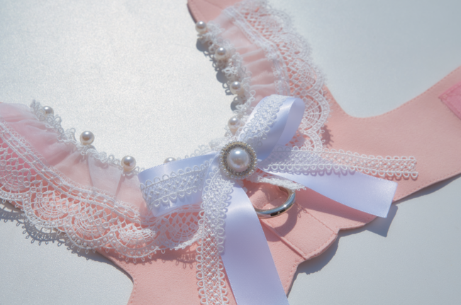 透明感のあるシアー生地に繊細なレースと艶やかで上質なパールの装飾が贅沢にあしらわれた襟が非常に美しい。風に揺れると優雅でエレガント、特別なハーネスです。優雅な愛犬との時間を演出する逸品。ハンドメイドならではの細やかな表現は、Shade独占契約の工房の経歴30年の一人の職人によって一つ一つ手作りされている。