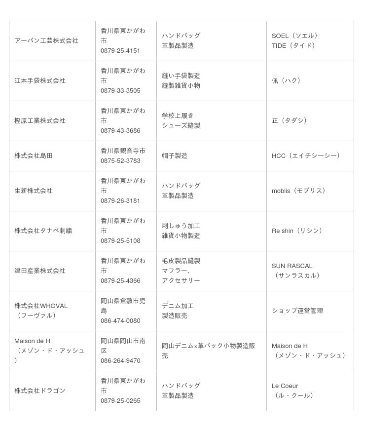 【参加企業】左列から社名、所在地、業種、出展ブランド(順不同)