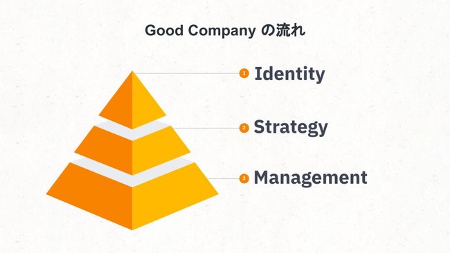 新コンテンツのコンセプトは弊社「Good Companyの法則」になります。良い会社の原理原則をまとめたものです。この原則には、流れがありシンプルです。経営者自身から始まる企業のIdentity(アイデンティティ)の確立、そのあとに経営のStrategy(戦略)の策定、そして人材等のManagement(マネジメント)の設計となります。