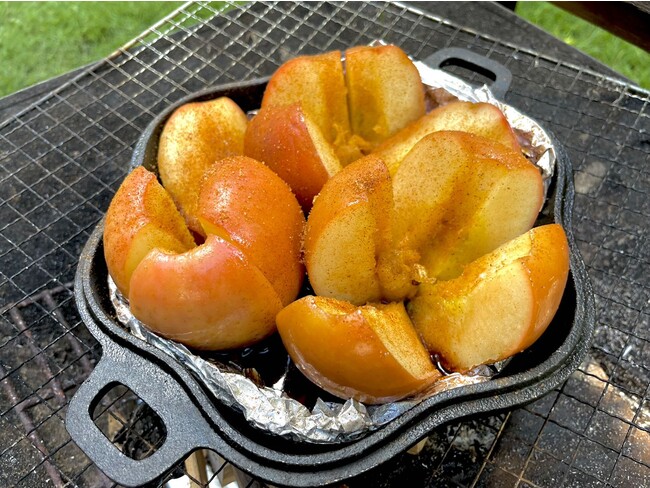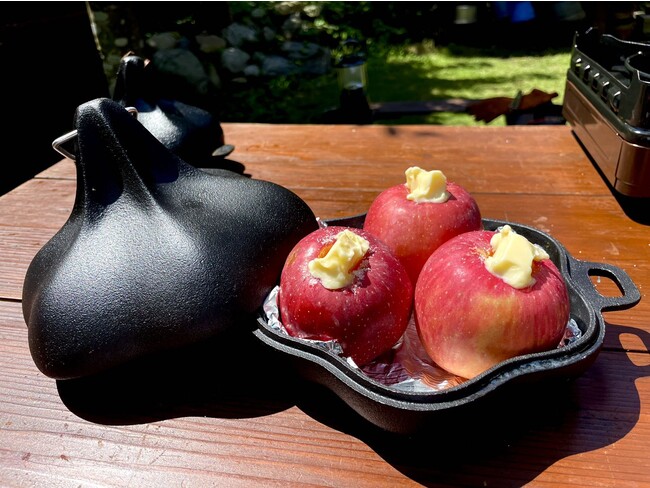 一般的な大きさのりんごだと3個入ります。グラニュー糖、バターを入れて最後にシナモンシュガーやはちみつを掛けるとキャンプ場で絶品のスイーツが完成