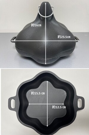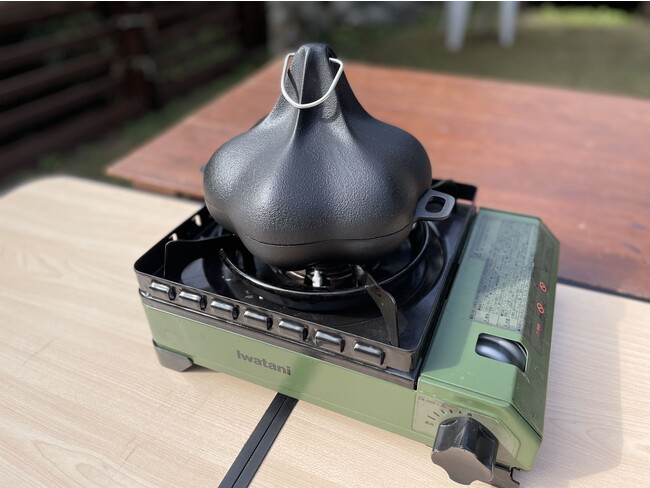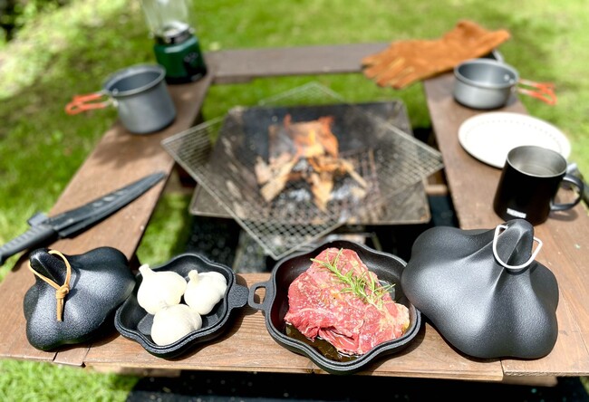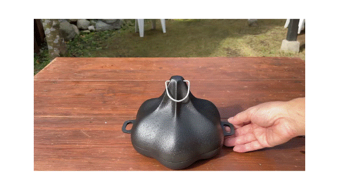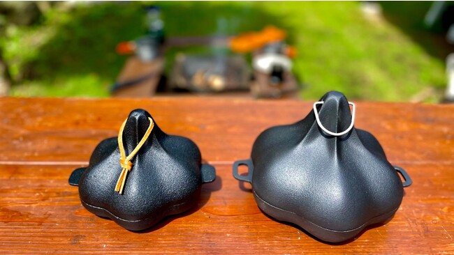 初代「にんにくん」の大きさでは、あっという間に料理を食べてしまい、人数が多いと何度も料理を作る必要がありました。そこで「にんにくん」の約1.3倍の大きさの「にんにくん2」を開発しました。また、大きくて重たいとどうしてもキャンプに持って行くには大変ですが、「にんにくん2」は、約1.15kgと「にんにくん」の約半分の重さにする事が出来ました。