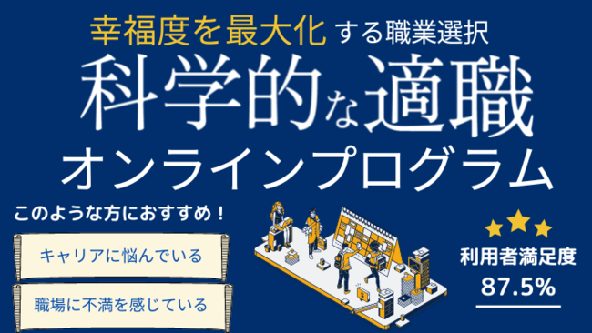 本プログラムは、10万部を超えるベストセラーとなった「科学的な適職」(出版社:クロスメディア・パブリッシング)で記されたメソッドの習得とセルフワークの実践を、より徹底的に行えるように、著者の鈴木祐氏監修の元企画された3ヶ月間のオンラインプログラムです。キャリアの常識を覆し、幸福度を上げる仕事とは何かを学ぶ“知識編”、自分にとって幸福度の高い仕事を考える“実践編”の二部構成となっております。「自分の価値観が明確になり、業界や給与にとらわれない判断で悔いのない転職活動ができた」などの喜びの声を多数いただき利用者様満足度は87.5%を記録しています。
