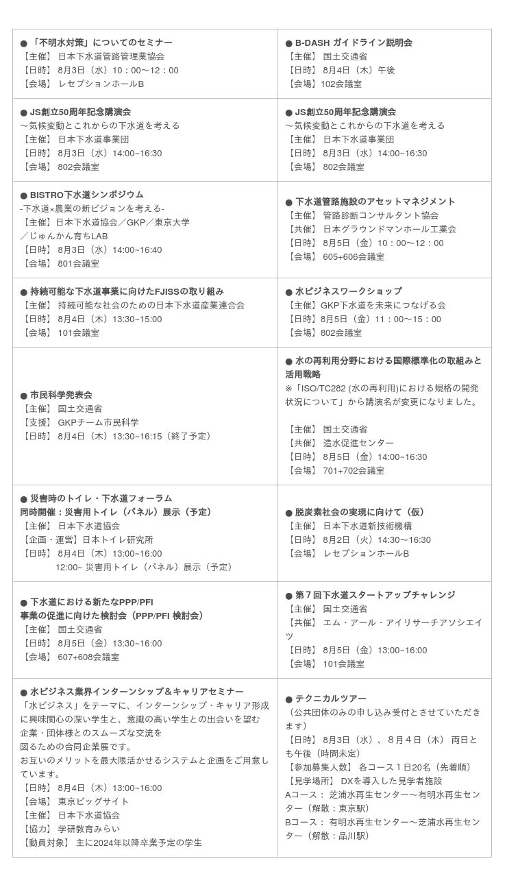 下水道業界の第一線で活躍する方々を講演者としてお招きするセミナー等を、展示会とあわせて開催しています(参照:併催企画一覧)。DXをはじめとする最新の下水道事業の動向や活用および取り組みの事例などの情報収集とあわせて展示会場を巡ることで、新たな気づきや課題解決につながるヒントの発見につながりますので、ぜひセミナー等もご聴講下さい。