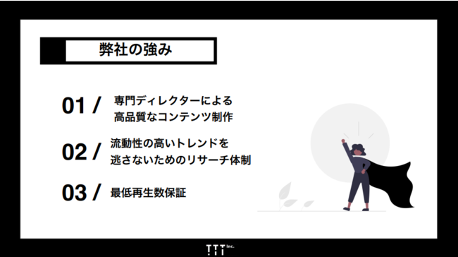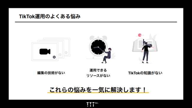 株式会社TTT(本社:大阪府大阪市中央区、代表:中川 隆大郎)は、アカウントの戦略設計から企画のご提案、撮影、編集、投稿、運用業務、効果測定レポーティング等TikTokアカウント運用に関する全ての運用全体を代行するサービス(以下、本サービス)を、提供開始しました。