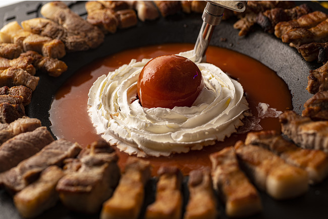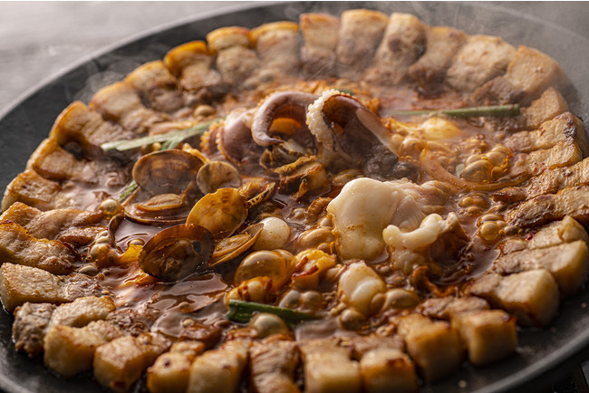 オリジナルで製作した鉄板鍋でサムギョプサルと旨味たっぷりのチゲ鍋を一度に楽しめ、上質な三元豚を焼くことで落ちた”オレイン酸たっぷり肉汁”でキムチや海鮮を炒めスペシャルなチゲ鍋を完成させます!
