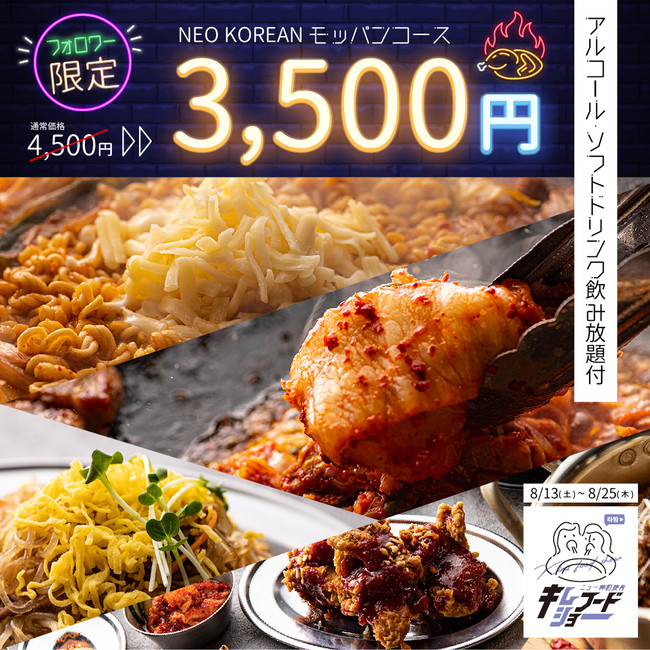 8/13(土)~8/25(木)の期間、フォロワー限定でNEO KOREANモッパンコース(飲み放題付) ¥4,500を¥3,500でご提供!