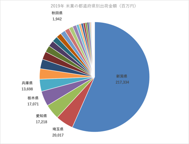 2019年の米菓の都道府県別出荷金額において、新潟県が217,334百万円で全体の半数以上を占めるのに対して、秋田県は1,942百万円で新潟県の1%にも満たない。
