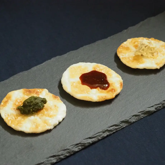 当商品には、秋田県産の一等米と玄米の素焼き煎餅を使用。お米と玄米の素直な甘みが溢れだす炭火手焼きのお煎餅の上に、秋田の地の旨みを凝縮させた特製ディップソースをたらして、煎餅とソースの絡みあう美味しさをお楽しみください。