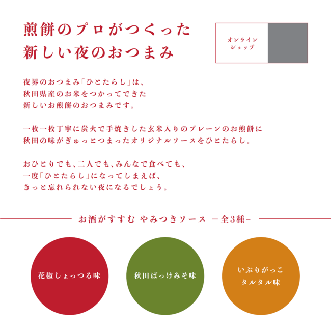 一枚一枚丁寧に炭火で手焼きした玄米入りのプレーンのお煎餅に、秋田の素材をふんだんに使用したオリジナルソースをたらして食べる商品です。