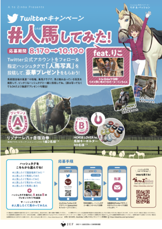Twitter公式アカウント(https://twitter.com/atozinba) をフォローし、馬と触れ合っている写真+指定ハッシュタグ(「#人馬したくて競技場来てみた」「#人馬したくて馬術してみた」「#人馬したくて馬のってみた」「#人馬したくて馬さわってみた」「#人馬したくて馬見に来た」から写真に合ったタグを選択)+プレゼントタイプ(AorB)と共にツイートしてご応募ください。抽選で「リゾナーレ八ヶ岳宿泊券(A)」や「馬蹄(ばてい)キーホルダー(B)」などのプレゼントが当たります。乗馬クラブや牧場で撮影した写真を送ってください。