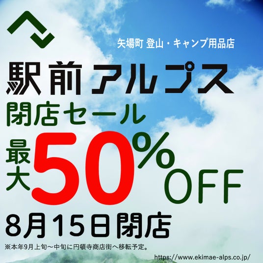 8月4日~最終日8月15日まで 登山・キャンプ用品販売の「駅前アルプス 矢場町店」が閉店のため最大50%OFFを含む店内の全商品を割引いて「全品割引閉店セール」を実施します。