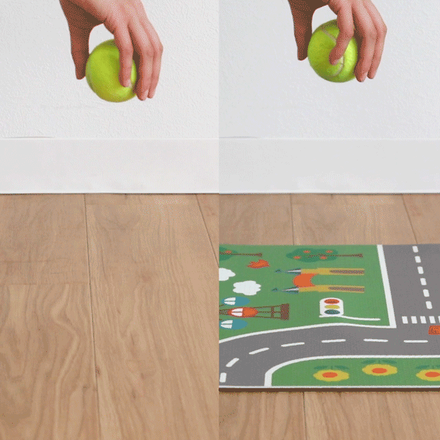 1枚が45×45cm、重さが250gと小さく軽いので、子どもが自分で敷くことができます。ズレないように裏面の4隅に吸着シートをつけているので、置くだけで簡単に敷き詰められます。