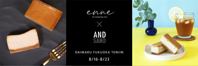 チーズケーキの可能性を日々探り続けているチーズケーキ専門店「enne the cheesecake shop(鹿児島県日置市)」と、様々な形のコラボレーションでスイーツを展開する「AND/SAND」が8月16日(火)より大丸福岡天神店にて、コラボし販売を行います。期間中は限定フレーバー「LEMON&CARDAMON CHEESECAKE SAND」やenne本店でも大人気の「エスプレッソチーズケーキ」も登場。チーズ好きにはたまらない8日間!ぜひ一度ご賞味ください!