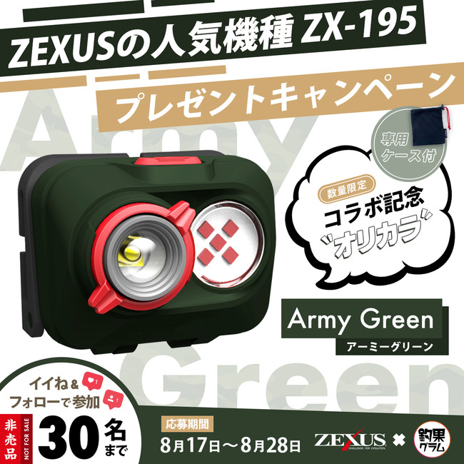 冨⼠灯器株式会社が展開するヘッドライトブランド「ZEXUS」は、釣り専門のInstagramアカウントとして最大級のフォロワーを持つ「釣果グラム」とタッグを組み、主力商品ZX-195のコラボ限定新⾊Army Green<アーミーグリーン>を30名様にプレゼントする大型キャンペーンを実施いたします。