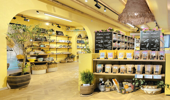 地中海を感じられる開放感ある店内では、オーガニック食品はじめ、スキンケア・ホームケア・チークウッドのキッチンツールなどの雑貨が揃い、おうち時間を楽しめる商品がたくさん。