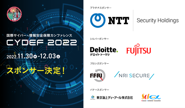 「CYDEF」実行委員会(事務局所在地:東京都豊島区(DCESビジネスサポート株式会社内):委員長 田中 達浩 元陸上自衛隊通信学校長)はNTTセキュリティホールディングス株式会社が国際サイバー・情報安全保障カンファレンス「CYDEF2022」の趣旨に賛同いただきプラチナスポンサーとして就任いただいたことをお知らせします。また、プラチナスポンサー以外にシルバースポンサーとしてアマゾンウェブサービスジャパン合同会社、デロイト トーマツ サイバー合同会社、富士通株式会社、ブロンズスポンサーとして株式会社FFRIセキュリティ、NRIセキュアテクノロジーズ株式会社も就任いただいたことをお知らせします。
