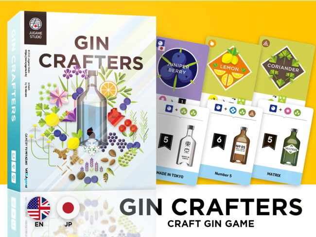 ジンは近年、日本国内でのフェス開催や国内外での売上が著しく伸びるなど、多くのシーンで話題になっています。本プロジェクトの企画者であるJUGAME STUDIOの丸野とWAZA gamesのミヤザキは、そんなジンの魅力に取り憑かれたボードゲームデザイナーです。偶然飲んだジンの美味しさに感動し、製法やストーリーに興味をもち、もっと多くの人にジンの面白さに気づいてほしいという思いからこの企画を立ち上げました。熱を上げるあまり、丸野は蒸留所へと足を運び見学したり、ミヤザキは個人的に自家製ジンを作ってしまうほどです。『ジンクラフターズ』は、ジンファンとしての熱量とボードゲームデザインの技術を惜しみなく注ぎ込んで開発しています。