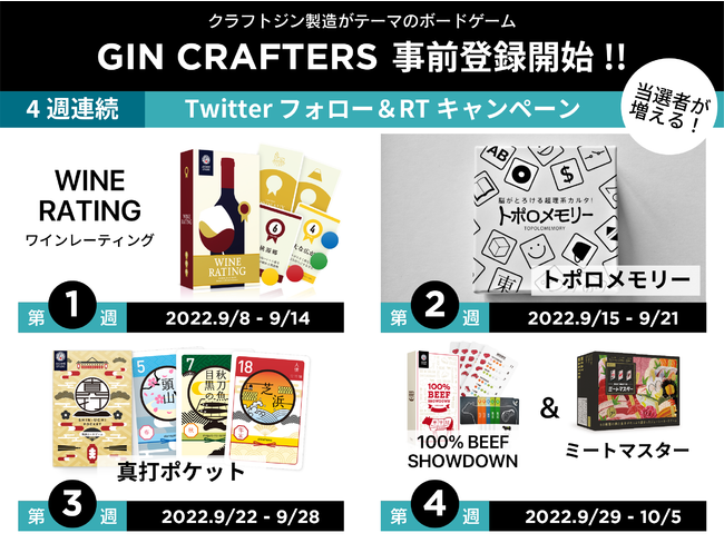 ボードゲームの企画と販売を手がけるJUGAME STUDIOは、2022年9月8日(木)にクラフトジンのボードゲーム『ジンクラフターズ』の年内開始予定のクラウドファンディングの事前登録をKickstarterで開始しました。それを記念して本日よりTwitterにて登録者数に応じて当選者が増えるボードゲームのプレゼントキャンペーンを4週連続で実施します。