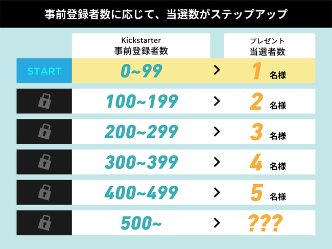 抽選で1名にプレゼントからスタートし、Kickstarterの事前登録者数に応じて下記のように当選者が増加していきます。詳細はキャンペーンツイートをご覧ください。