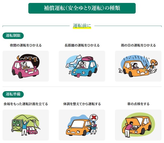加齢に伴う運転技能の不安を補うために、体調や天候、道路状況を考えて安全に運転することを「補償運転(安全ゆとり運転)」と言います。例えば、夜は周りが見えにくいから運転は昼間だけにする、雨の日は視界が悪いから運転は晴れの日だけにする、遠出はやめて、運転は近所のスーパーと病院だけにするなどです。