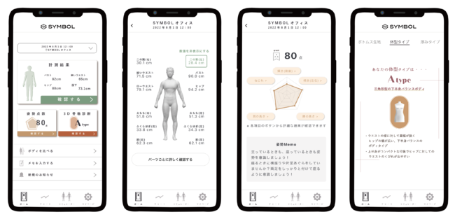 「3D骨格診断」は、SYMBOLが開発を手がける3Dボディスキャナー「BodyCapture II」及びその解析アプリ「MyRealBody(R)」を通じて提供されるウェブサービスです。サービス利用者がBodyCapture IIで全身をスキャンすると、まずSYMBOLが自社開発したアルゴリズムに基づいて骨格タイプを診断します。利用者は、診断結果をMyRealBody(R)上で確認できるとともに、科学的な視点で似合うアパレル商品の提案やパーソナルスタイリングサービスを店舗スタッフから受けることができます。従来は人による目視や触診での長時間の診断が一般的でしたが、本サービスでは短時間で3Dボディスキャナーによる精緻な計測結果を利用者に提供することが可能になります。