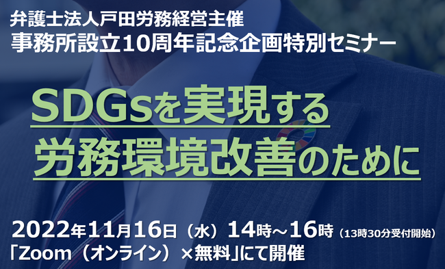 使用者側労務問題に精通した弁護士法人戸田労務経営(所在地:千葉県船橋市)は、事務所設立10周年を記念し、「SDGsを実現する労務環境改善のために」をテーマに、無料・オンラインで2022年11月16日(水)に開催いたします。
