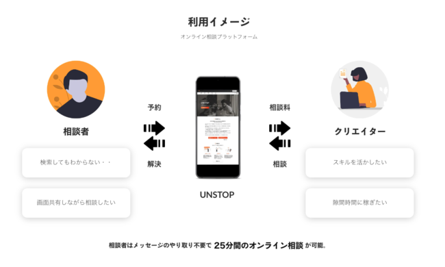 UNSTOPはWEB制作に関する悩みをクリエイターにいつでもオンラインで相談することができるマッチングサイトです。技術面や営業方法など様々な悩みを持つ独学者や駆け出しの学習者とクリエイターを繋ぎ、1コマ25分によるオンライン相談で解決します。9月9日(金)のリリースにつき、講師及び相談者の事前登録(~9月8日(木)23:59まで)を開始します。