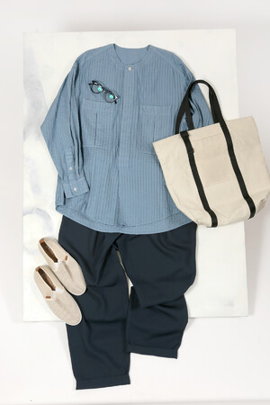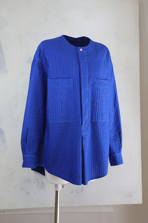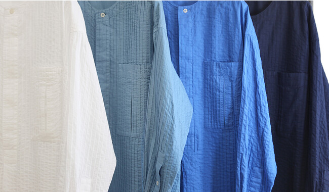 手仕事で仕上げるピンタックを全体に入れた、ノーカラープルオーバーシャツ。ピンタックを入れることにより表現される、ストライプのような縞模様と、立体的な奥行きが特徴の1枚。さらに製品染めを行う事により加わる独特のこなれ感と、品のあるしなやかさ、深みのあるブルーの色が唯一無二の存在感をつくる。