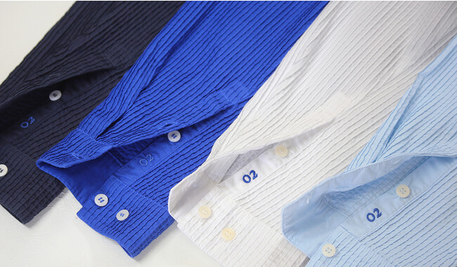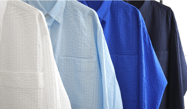 BLUE by ymf lab.は天然素材を使用し、他にはないピンタックワークと、製品染めで実現する青の表現を通して、唯一無二の存在感を放つユニセックスのシャツを提案しています。