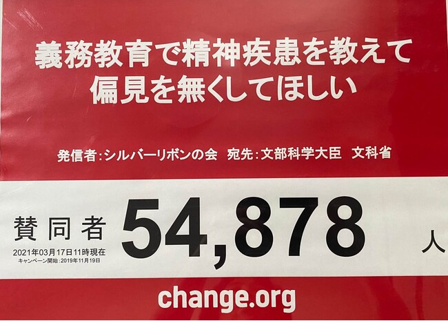 2019年11月に代表森野がオンライン署名サイトchange.orgにて、「義務教育で精神疾患を教えて偏見を無くしてほしい」の署名活動を開始し、同年12月署名活動のグループが発足しました。2021年2月グループの名称をシルバーリボンの会へ変更し同年3月文部科学大臣宛に5万4千名以上の署名を提出。2022年4月には内閣府超党派の自殺対策議員連盟、若者ワーキングチームにて発表をいたしました。