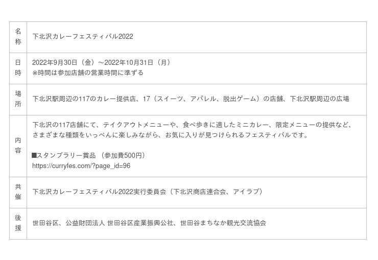 株式会社アイラブ(東京都世田谷区、代表取締役社長 西山友則、以下「アイラブ」)は、下北沢商店連合会(会長 柏雅康)と、2022年9月30日(金)~10月31日(月)までの32日間、下北沢のオリジナルカレーが楽しめる「下北沢カレーフェスティバル2022(以下「下北沢カレーフェス」)」を開催します。