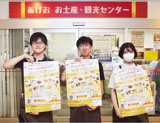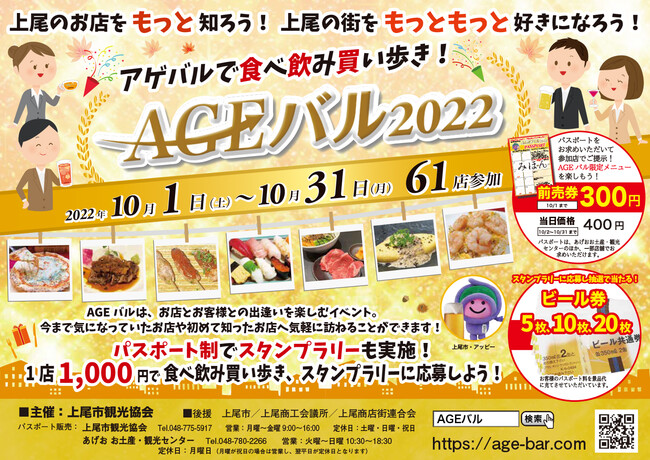 上尾市観光協会が主催する、上尾の秋の風物詩「AGEバル(アゲバル)」が3年ぶりに復活し、街を盛り上げます。今回、JR上尾駅周辺にある61店が、1,000円のお得なメニューを用意。パンフレットを見ながら、10月1日~31日のイベント期間中、気軽に食べ飲み歩きを楽しみましょう!