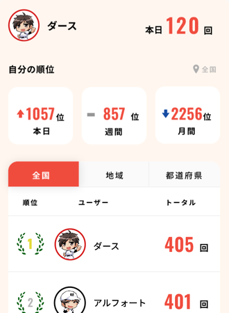 また、このデータを使って「全国」「地域」「都道府県」別のランキングに参加・閲覧することができ、全国のプレーヤーや友だちと一緒に競い合う参加型の機能で、さらに楽しく続けられる仕組みになっています。