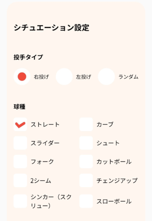 練習の速度・回数・インターバル・球種・コースなど、さまざまなシチュエーションを設定でき、通常の練習だけでなく、特定の相手を想定した練習も可能です。