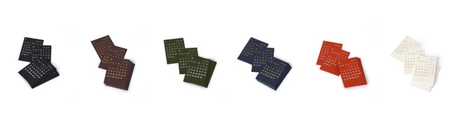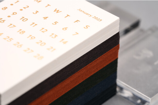 CLARA(クララ)は、日付が箔押しされた12枚のカレンダーを手染めされたアクリル台座に置くだけのミニマルデザインが人気の卓上カレンダー 。6色展開。カレンダーのみのリフィル販売もあります。
