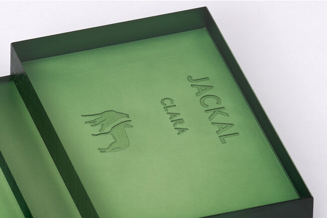 CLARA(クララ)は、台座の溝に12枚のカレンダーを置くだけのシンプルなデザイン。翌年以降もアクリル台座に新しい年のカレンダーを取り替えるのみ。エコでシンプルなCLARA(クララ)ですが細部には小粋で素敵なこだわりが詰まっています。カレンダーカードは優しい風合いの厚手の紙に箔押、必要な情報のみ表記され、そのサイズながら見やすく、スッキリとしたデザイン。そして情報だけでなく、ルックスもミニマルに統一させるため、台座はカレンダーカードの各カラーに合わせ、一つひとつ手作業で染めています。天面は鏡面加工、側面はブラスト加工でマットに。光の当たり方によって表情を変え、アクリルなのにガラスの様な深みを作り出しています。そしてJACKALロゴは控え目でありながら深くレーザーにてエングレーブされ、控え目でありながら主張も忘れないデザインは場所を選びません。