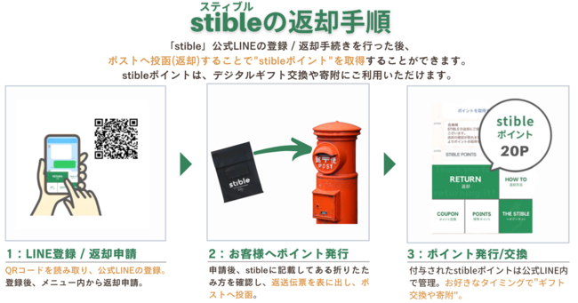 ・返却の確認が出来次第ご利用ストアで使用できるクーポン&stibleポイントが配布。