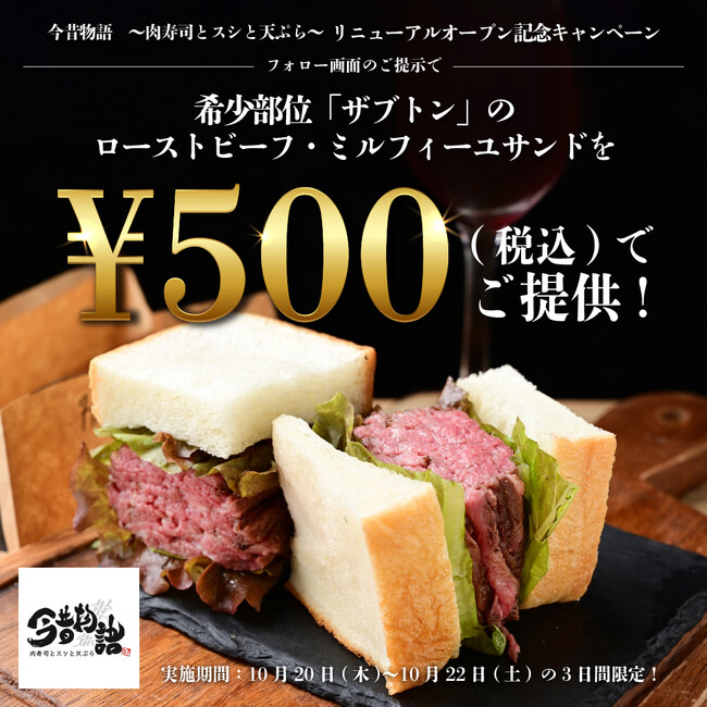 10月20日(木)~22日(土)の3日間限定!フォロー画面を提示していただいたお客様に希少部位「ザブトン」のローストビーフ・ミルフィーユサンド ¥1,100(税込)をワンコイン¥500(税込)でご提供いたします。是非この機会にご来店下さい。