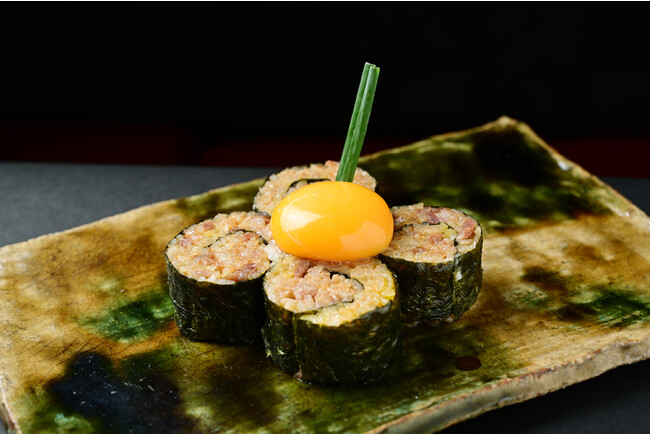 サシの入った九州産和牛の中トロのみを使用。シャリは赤酢と米酢に独自調味料配合のオリジナルブレンドで提供しております。特製甘辛ソースの和牛とろたくを、真ん中にのった卵黄に絡めながらお召し上がりください。
