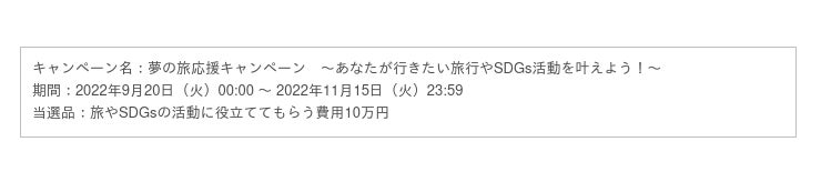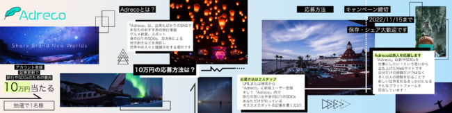 株式会社Owl Note(本社:東京都渋谷区、代表取締役社長:藤川亨祐)は、全ての旅・アドベンチャーに特化した新しいSNSサービス「Adreco(アドレコ)」(https://adreco.net/)は、SNSオープンを記念し、期間中に「Adreco(アドレコ)」への登録&投稿で旅行やSDGs活動への費用10万円が1名様へ当たる夢の旅行キャンペーンを2022年9月20日(火)より開始しています。