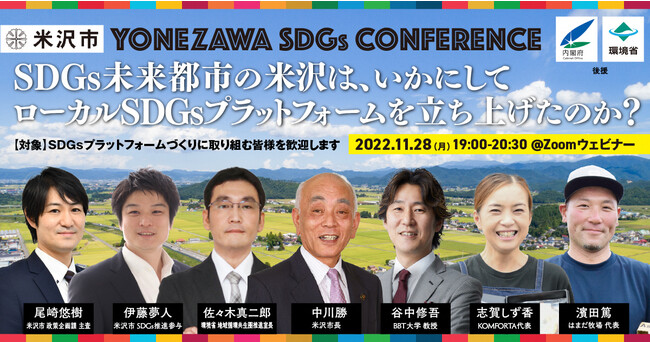 内閣府「SDGs未来都市」と環境省「地域循環共生圏づくりプラットフォーム」に選定された自治体としてSDGsを推進する山形県米沢市(市長:中川勝)は、2022年11月28日(月)夜、内閣府と環境省の後援による「米沢SDGsカンファレンス」をオンライン開催します。ローカルSDGsのプラットフォームづくりをテーマとして、その実践ノウハウを公開するカンファレンスです。ゲスト登壇者には、BBT大学 教授の谷中修吾氏、環境省 地域循環共生圏推進室長の佐々木真二郎氏を迎え、米沢市内の実践的な取組からKOMFORTA 代表の志賀しず香氏、はまだ牧場 代表の濱田篤氏を招聘するとともに、本市よりSDGs推進参与の伊藤夢人、政策企画課の尾崎悠樹が登壇します。全国各地でSDGsプラットフォームづくりに取り組む皆様のオンライン参加を歓迎し、東北のSDGs未来都市である米沢市が経験したプラットフォームづくりの知見を共有します。
