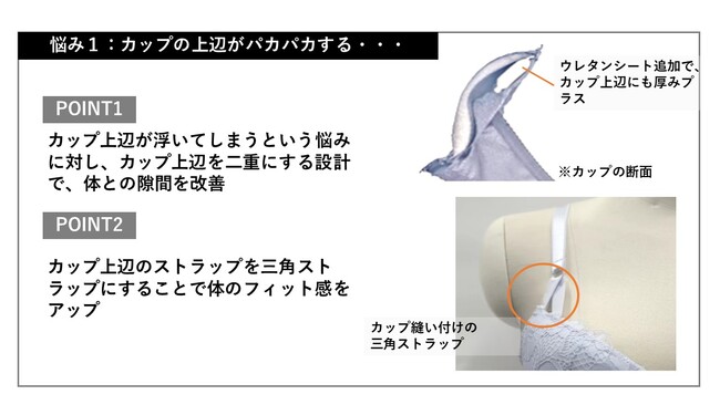 カップ上辺が浮いてしまうという悩みに対し、カップ上辺を二重にする設計で、体との隙間を改善
