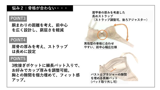 その結果、骨格や乳下がりの距離、肩の骨の厚みなど、既存の商品では解決できない