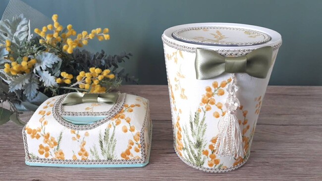 フジタカSHOPでは、ミモザ柄のファッション小物やキッチン雑貨、当店でしか手に入らないハンドメイドの一点もののミモザフラワーインテリアやミモザ柄のカルトナージュ雑貨もございます。