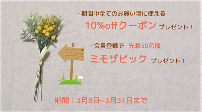 期間中、ご購入の際に10%割引クーポンがお使い頂けます。また会員登録の先着50名様にミモザのミニピック(アーティフィシャルフラワー)をプレゼント致します。