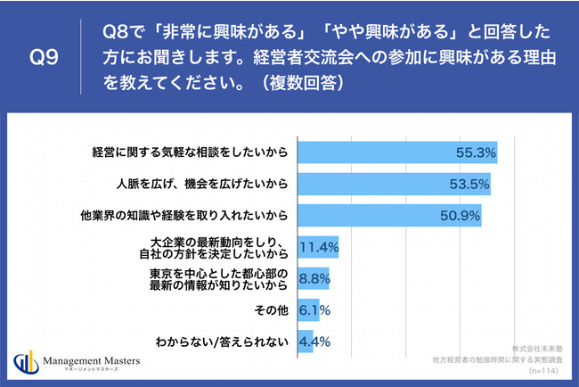 Q8で「非常に興味がある」「やや興味がある」と回答した方に、「Q9.経営者交流会への参加に興味がある理由を教えてください。(複数回答)」(n=114)と質問したところ、「経営に関する気軽な相談をしたいから」が55.3%、「人脈を広げ、機会を広げたいから」が53.5%、「他業界の知識や経験を取り入れたいから」が50.9%という回答となりました。