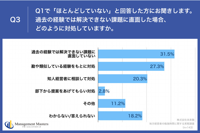 Q1で「ほとんどしていない」と回答した方に、「Q3.過去の経験では解決できない課題に直面した場合、どのように対処していますか。」(n=143)と質問したところ、「過去の経験では解決できない課題に直面していない」が31.5%、「勘や類似している経験をもとに対処」が27.3%、「知人経営者に相談して対処」が20.3%という回答となりました。