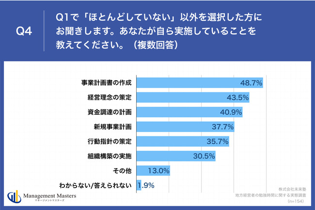 Q1で「ほとんどしていない」以外を選択した方に、「Q4.あなたが自ら実施していることを教えてください。(複数回答)」(n=154)と質問したところ、「事業計画書の作成」が48.7%、「経営理念の策定」が43.5%、「資金調達の計画」が40.9%という回答となりました。