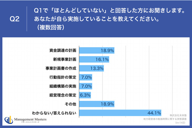 Q1で「ほとんどしていない」と回答した方に、「Q2.あなたが自ら実施していることを教えてください。(複数回答)」(n=143)と質問したところ、「資金調達の計画」が18.9%、「新規事業計画」が16.1%、「事業計画書の作成」13.3%という回答となりました。