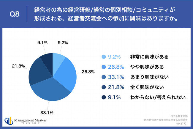 「Q8.経営者の為の経営研修/経営の個別相談/コミュニティが形成される、経営者交流会への参加に興味はありますか。」(n=317)と質問したところ、「非常に興味がある」が9.2%、「やや興味がある」が26.8%という回答となりました。